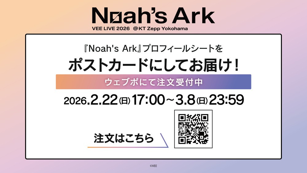 本日2月22日(日)から、VEE LIVE 2026 『Noah’s Ark』にて展示されたプロフィールシートデザインのポストカードの注文受付を申込み専用サイト“ウェブポ”にて開始いたしました!
