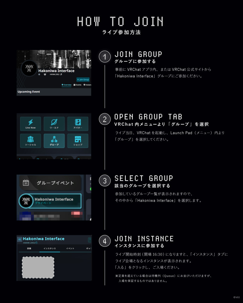 本ライブは、VRChatグループ機能を使用したインスタンスでの開催となります。